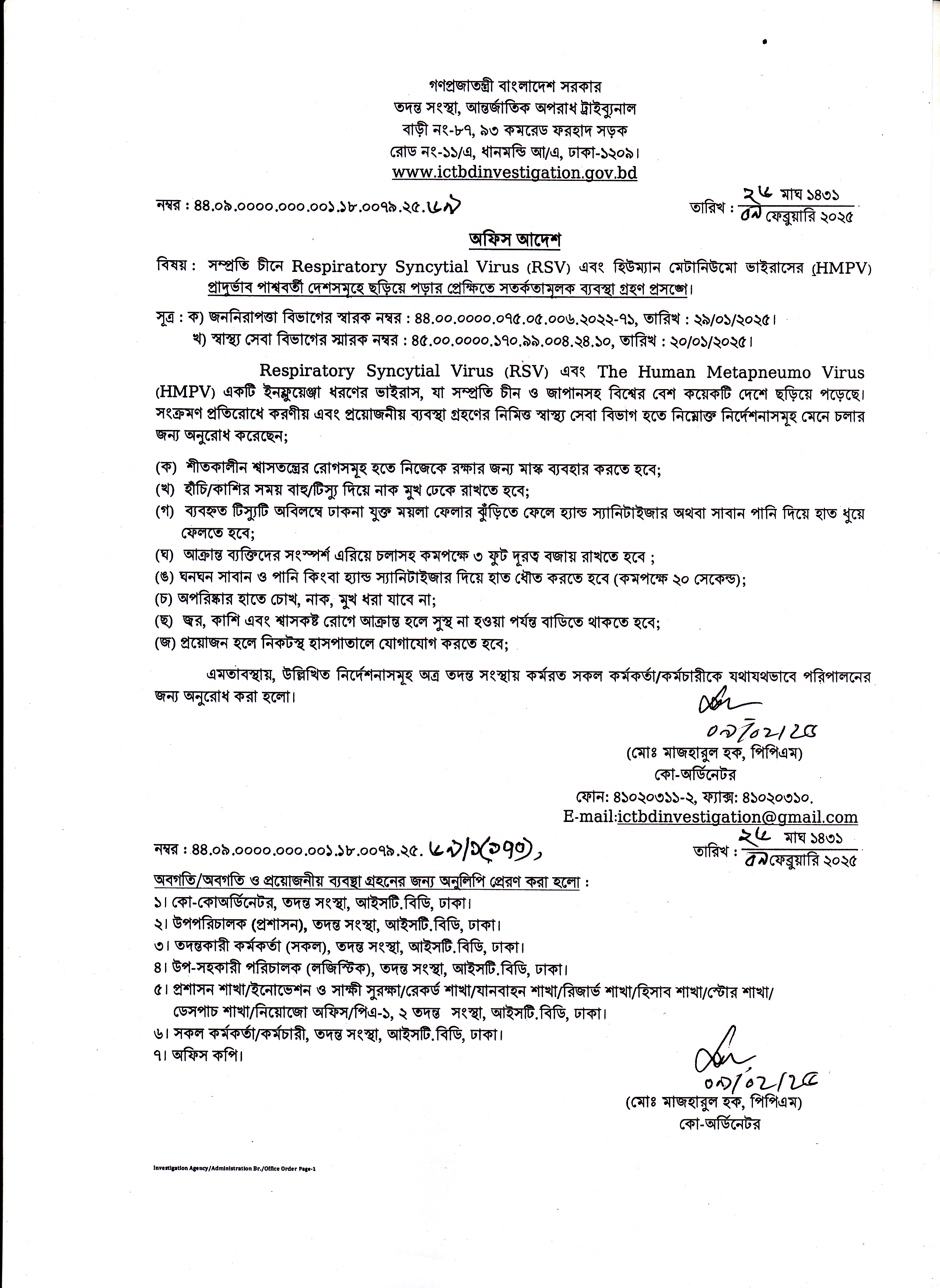 | ৪ | Respiratory Syncytial Virus এর সতর্কতামূলক ব্যবস্থা গ্রহণ প্রসঙ্গে। | ১০-০২-২০২৫ | দেখুন |